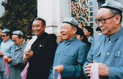 圖為習仲勛(右二)與烏蘭夫(右一)、十世班禪(右三)、賽福鼎?艾則孜(右四)、楊靜仁(右五)在北京民族文化宮。圖片來源:《中國西藏》雜志