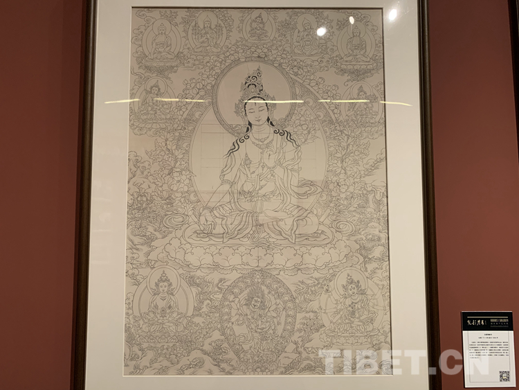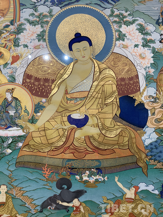 很多人對唐卡并不陌生,但對一幅唐卡是怎么被畫出來的卻是一知半解。唐卡的內(nèi)容大多來源于佛教里的經(jīng)文,里面有詳細(xì)的文字描寫,佛的穿著,顏色的搭配,甚至是佛們佩戴的首飾、拿的法器都有明確且詳細(xì)的記錄和與描寫。藝術(shù)家還需要有豐富的想象力和創(chuàng)造力,要有很強(qiáng)的構(gòu)圖能力,最重要的是要遵照《度量經(jīng)》等佛教儀軌,正規(guī)的去畫?!皠?chuàng)作一幅唐卡不容易,藝術(shù)家必須要懂佛教的文化、儀軌,懂《度量經(jīng)》,再加上藝術(shù)家自己的藝術(shù)創(chuàng)造能力,才能夠畫好一幅唐卡,這需要藝術(shù)家的綜合能力?!蹦锉纠^續(xù)說:“起稿、涂色、暈染、拉金線、拉線條等每一步驟都是在考核藝術(shù)家自身的能力,藝術(shù)家自己要不斷地學(xué)習(xí):學(xué)習(xí)佛教文化,了解文化的內(nèi)涵,藝術(shù)家需要更多地把心思投入到唐卡,并提高自身的藝術(shù)造詣才能夠畫好一幅唐卡。”