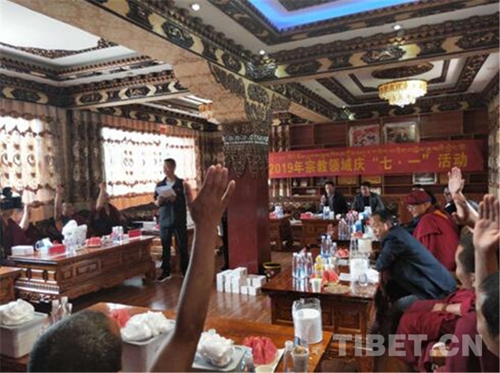 舉行升國旗唱國歌儀式。7月1日上午十點(diǎn)整,巴宜區(qū)統(tǒng)戰(zhàn)民宗、工商聯(lián)黨員干部、駐寺黨員干部、寺廟僧尼、珠曲登村和簡切村村民共70余人在珠曲登寺舉行升國旗儀式,雄壯嘹亮的國歌聲響徹全場(chǎng)。