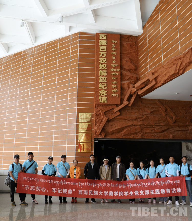 圖為暑期實(shí)踐團(tuán)師生代表在西藏百萬(wàn)農(nóng)奴解放紀(jì)念館前