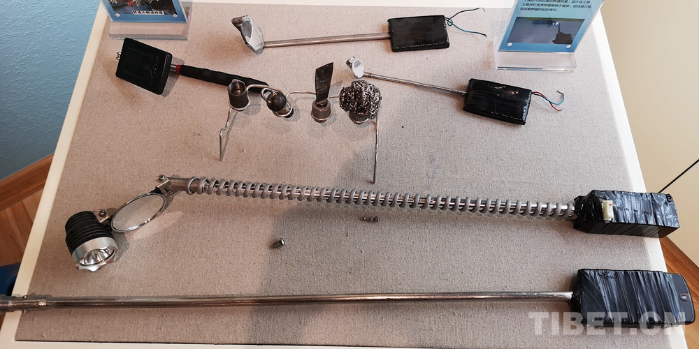 圖為楊永磊設(shè)計的管道內(nèi)熔渣挖取工具(圖上部三個)、焊縫外觀檢查工具(圖下部兩個),前者能以鏟、掃、粘或吸的方式將管道內(nèi)熔渣清理干凈,后者以燈照亮焊縫倒映于鏡面,便于觀察刁鉆位置焊縫的實際情況 攝影:李元梅