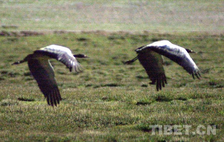 圖為正在色林錯(cuò)國(guó)家級(jí)自然保護(hù)區(qū)飛翔的黑頸鶴(唐召明2001年攝)