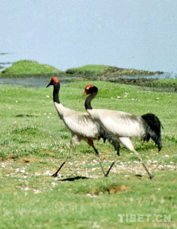 圖為一對(duì)在色林錯(cuò)國(guó)家級(jí)自然保護(hù)區(qū)湖邊漫步的黑頸鶴(唐召明2001年攝)