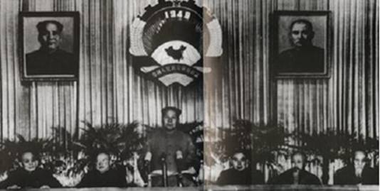 1954年12月21日,全國政協(xié)二屆一次會議在京舉行。會議修改了政協(xié)章程。圖為大會主席臺。左起:郭沫若、李濟深、毛澤東、周恩來、沈鈞儒、陳叔通 圖片來源:人民網(wǎng)