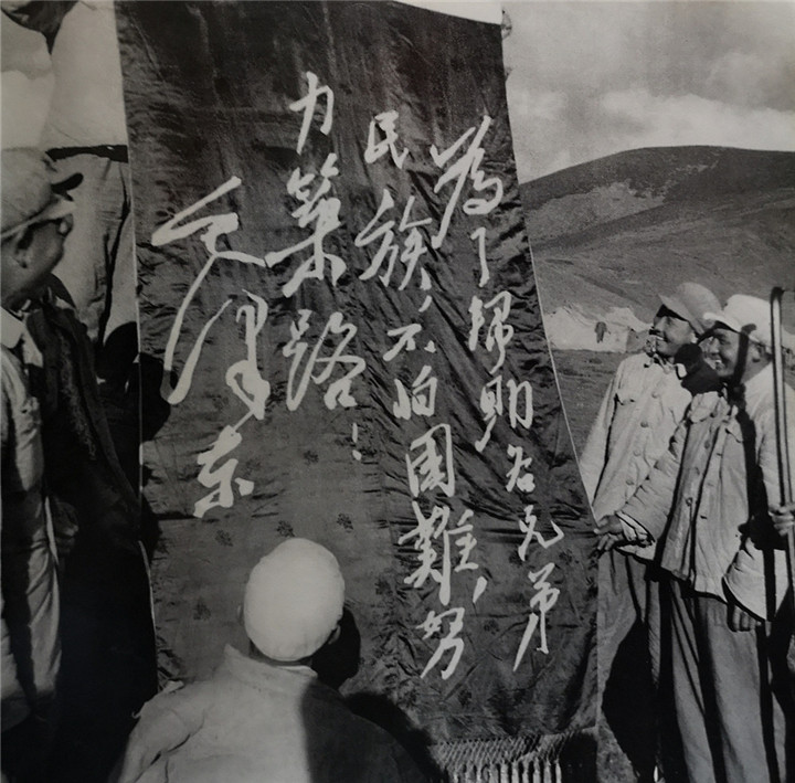 毛主席號(hào)召“為了幫助各兄弟民族,不怕困難,努力筑路!”
