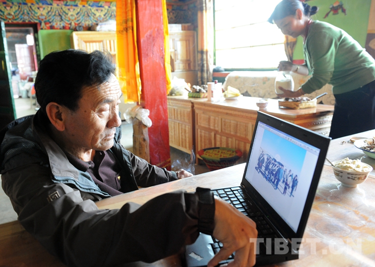 圖為索朗公布從拉薩來到班戈縣青龍鄉(xiāng)姐姐家探親時(shí),沒想到能見到來看望他的老朋友唐召明。這是索朗公布高興地觀看老朋友電腦里的圖片,回憶兩人30年來不尋常的友誼(唐召明2012年8月2日攝)