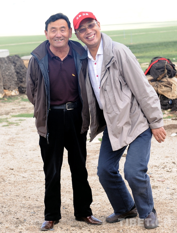 圖為唐召明(右)在班戈縣采訪時(shí),聽說索朗公布從拉薩來到該縣青龍鄉(xiāng)姐姐家探親,專程去看望索朗公布。兩人相見甚是高興,并合影留念 (唐召明2012年8月2日攝)