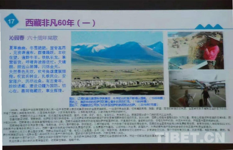 唐召明以照片敘事、詩(shī)詞抒情的形式,把西藏60多年來(lái)的發(fā)展變化和其間的感人瞬間展示出來(lái),謳歌偉大的時(shí)代和詮釋這一偉大時(shí)代的“老西藏精神”。經(jīng)北京建藏援藏協(xié)會(huì)原副會(huì)長(zhǎng)朱強(qiáng)配圖賦詩(shī),有了“百首詩(shī)詞、百?gòu)垐D文”的以詩(shī)配圖資料。一張張感人的照片和一首首充滿(mǎn)激情的詩(shī)歌,展示了在中國(guó)共產(chǎn)黨的領(lǐng)導(dǎo)下,新西藏在“短短幾十年,跨越上千年”的歷史巨變;道出了一切為了西藏人民的“老西藏精神”時(shí)代內(nèi)涵。全場(chǎng)聽(tīng)眾凝神專(zhuān)注,不時(shí)響起熱烈的掌聲。