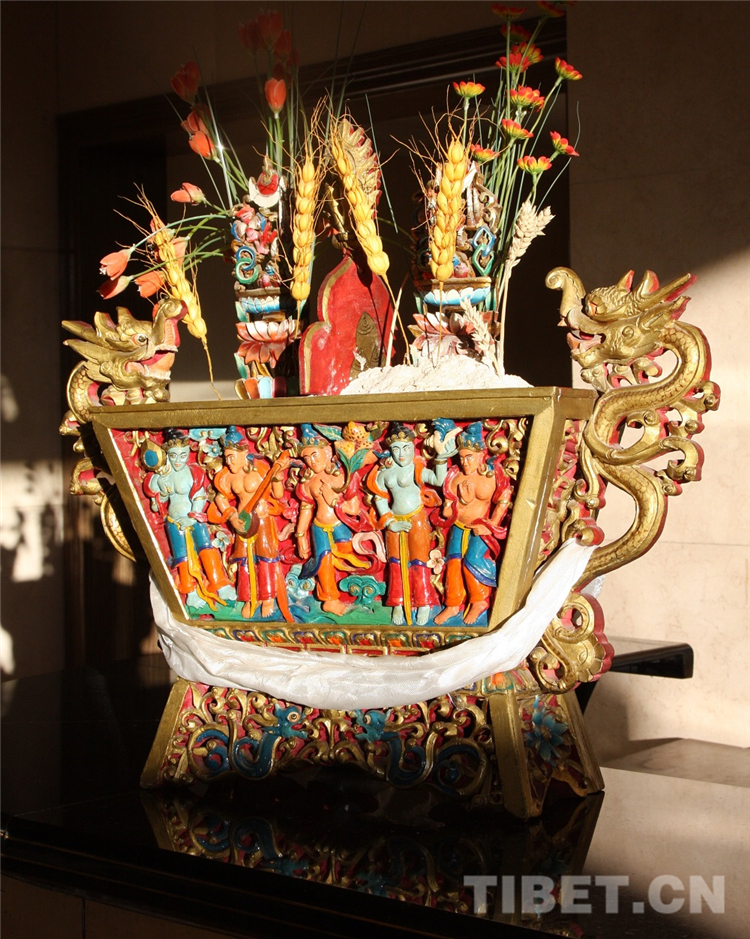 藏歷1月1日,是藏族人民一年一度最重要的節(jié)日。在拉薩,從藏歷12月初開(kāi)始,我的鄰居們就開(kāi)始打掃衛(wèi)生、準(zhǔn)備年貨了,其中,木雕彩繪的精致方斗“切瑪”和一些面粉制作的點(diǎn)心是每家必備的供品?!扒鞋敗眱?nèi)裝滿(mǎn)酥油拌好的糌粑、炒熟的青稞和人參果等食品,上面插上青稞穗、雞冠花,有的還要撒上酥油做的彩花板。同時(shí),供品的旁邊還要擺放一個(gè)彩色酥油花塑的羊頭,到了初一那天,再將提前浸泡長(zhǎng)出兩寸青苗的青稞種子擺于佛龕茶幾之上。這些擺設(shè)表達(dá)著對(duì)新的一年風(fēng)調(diào)雨順、農(nóng)牧業(yè)獲得豐收祈愿。