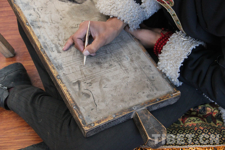 圖為桑昂然珠在木板上練習(xí)繪畫(huà)技法。這種木板上面先涂上墨水,再涂一層牛油,最后涂上牛糞燒成的灰,用削尖的木棍繪畫(huà),畫(huà)過(guò)的痕跡可以擦掉反復(fù)使用 攝影:李元梅