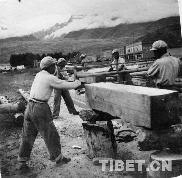 圖為當(dāng)年十八軍指戰(zhàn)員自己伐木建房子