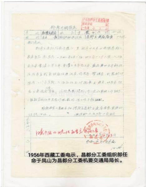 在1956年全國(guó)轟轟烈烈的社會(huì)主義改造高潮中,西藏迎來了一個(gè)劃時(shí)代的日子,4月22日西藏自治區(qū)籌備委員會(huì)成立,領(lǐng)導(dǎo)人講話都提到了民主改革問題。西藏工委在執(zhí)行中央“慎重穩(wěn)進(jìn)”的過程中,準(zhǔn)備在昌都、日喀則實(shí)行民主改革試點(diǎn)。因之接踵而來的是擴(kuò)大機(jī)構(gòu)增加人員,進(jìn)行大力宣傳和試點(diǎn)。父親負(fù)責(zé)的昌都分工委機(jī)要交通站也在擴(kuò)充之列,由機(jī)要交通站擴(kuò)充為機(jī)要交通局,直屬昌都分工委領(lǐng)導(dǎo)。在西藏工委電示下,昌都分工委組織部下文任命父親為機(jī)要交通局局長(zhǎng),周孝山為副局長(zhǎng),從1956年10月16日走馬上任。母親非常清楚地記著機(jī)要交通局除了上面提到的幾位,還有陶躍忠、王佳廉、唐俊生、韓進(jìn)先、鄭海超等近20多位從事機(jī)要交通的同志。