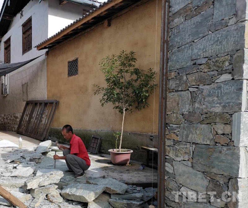 漫步村間,石板鋪就的道路縱橫交錯,與居民房舍相連。鳥語蟬鳴,人與自然在這里和諧共生。遠(yuǎn)處傳來石頭的敲擊聲,沿石板路而上,循聲走近,看到一位大爺在家門口敲擊著大石塊,記者便好奇地上前詢問。這位大爺告訴我們,他在修建自家的大門。