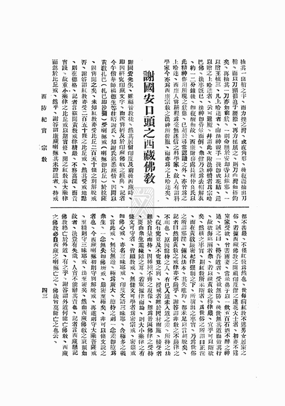 1887年,謝國(guó)安出生在今四川省甘孜縣絨壩岔。他的藏名為多吉卓巴,后因信仰基督教,取名Paul Sherap(人稱智慧保羅,我們注意到此名帶有藏文音譯),漢名謝國(guó)安。10歲時(shí),他離開家鄉(xiāng)進(jìn)入拉薩哲蚌寺學(xué)經(jīng)。不久,謝國(guó)安離開寺廟,跟隨藏商商隊(duì)去了錫金甘托克、印度大吉嶺的教會(huì)學(xué)校學(xué)習(xí)藏文、英文和梵文。后應(yīng)孟加拉亞洲學(xué)會(huì)之請(qǐng),到加爾各答參與校訂《藏文大藏經(jīng)·甘珠爾》。他兼通藏、英、梵三種文字,熟練地用藏、英語會(huì)話。辛亥革命爆發(fā)后,他返回內(nèi)地,之后定居康定。此后一段時(shí)間在康定的國(guó)立師范學(xué)校任教,主持編寫了多部教材,如《西康國(guó)語教科書》(8冊(cè))、《西康常識(shí)教科書》(8冊(cè))、《西康公民教科書》等。這套教科書編輯方法,系根據(jù)教育部頒“小學(xué)課程標(biāo)準(zhǔn)”及西康特殊環(huán)境,先編漢文,再用藏文譯注,對(duì)民國(guó)時(shí)期西康教育發(fā)展和推廣起到特殊的推動(dòng)作用。他曾在西康舉辦的“縣訓(xùn)班”擔(dān)任藏文教員。當(dāng)時(shí)著名學(xué)者李思純?cè)诳刀ㄒ娺^他,印象較好,認(rèn)為他“居印度甚久,故能操英語等,現(xiàn)居康定,研習(xí)藏文甚深?!?938年,著名學(xué)者柯象峰到康定一帶考察時(shí),受到謝的熱情接待和幫助。他在日記里對(duì)謝國(guó)安頗有贊詞,10月9日的日記中提到“午時(shí)左右,謝國(guó)安君來訪,托其購佛經(jīng)數(shù)部?!睅滋旌笾x國(guó)安即將“購得之佛經(jīng)十余部一一為之譯名及指出出版處”。