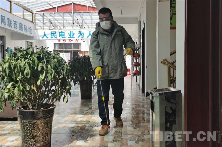 圖為嚴鋒為項目部各辦公住宿場所進行消毒