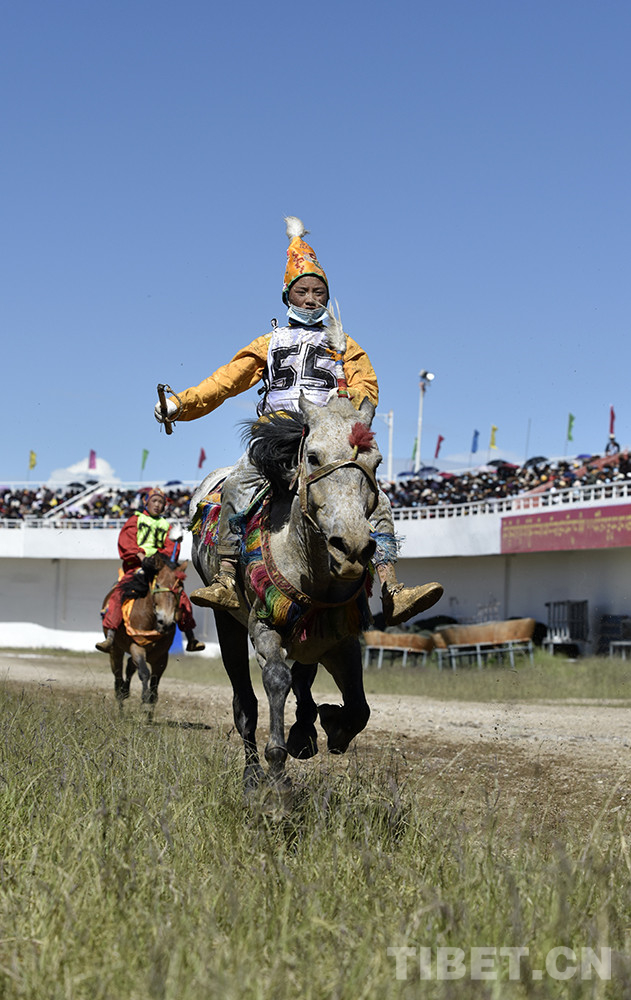 8月12日上午,西藏自治區(qū)那曲市2020羌塘恰青格薩爾賽馬藝術(shù)節(jié)的重頭戲——場(chǎng)內(nèi)速度賽馬比賽開(kāi)始。賽道內(nèi),沙塵飛濺;看臺(tái)上,座無(wú)虛席,吶喊助威。