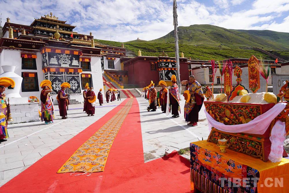 為了迎接十一世班禪的到來,索縣贊丹寺也早早地做好了準備。贊丹寺是藏北地區(qū)最早的格魯派寺院,修建在雅拉多山頂上,外形酷似布達拉宮。寺內(nèi)珍藏大量的佛像、壁畫、藏經(jīng)印冊等,具有很高的文物和藝術(shù)價值。8月21日,在寺廟僧眾的誦經(jīng)聲中,十一世班禪登上措欽大殿寶座為僧眾摸頂賜福,傳授《達妥瑪開光儀軌》《上師供儀軌》《時輪金剛祈愿文》。