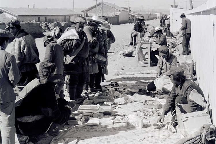 這是在青藏公路進(jìn)藏第一站的安多縣城,內(nèi)地“候鳥(niǎo)”型新客人擺地?cái)偸圪u(mài)小商品(唐召明1987年攝)