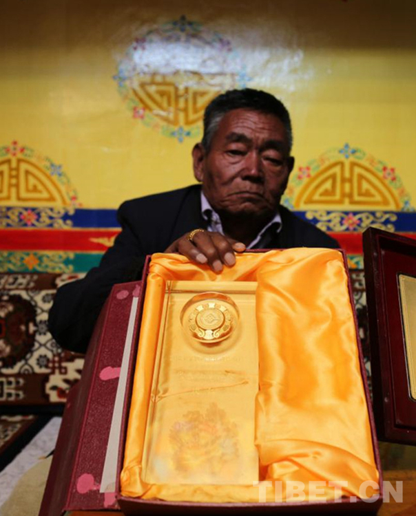 圖為次仁和他的國家級傳承人獎杯