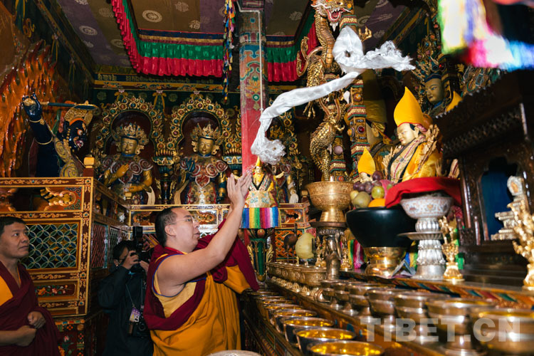 9月24日,十一世班禪來(lái)到乃堆拉群山中的噶舉寺,在寺院僧人引領(lǐng)下,緩步走入寺院大殿禮佛,為大殿開光加持。隨后十一世班禪前往主殿二樓依次朝拜了甘珠爾殿、噶舉頗章殿、度母殿、強(qiáng)康殿和護(hù)法殿。
