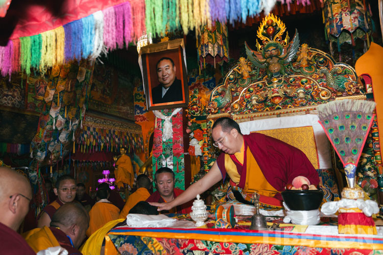 圖為十一世班禪在吉汝寺展佛臺(tái)前為展佛唐卡開光 攝影:鄭朔