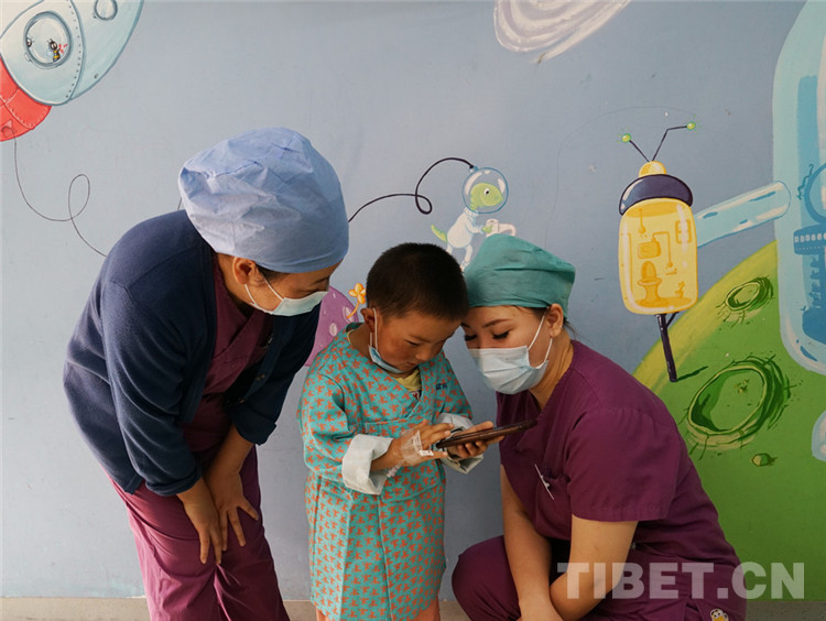 在記者采訪過程中,呷瑪龍刀尼瑪閑不住地跑來跑去,一會(huì)兒跑去看病友妹妹呷絨拉姆有沒有乖乖睡覺,一會(huì)兒又拿起舅舅的手機(jī)刷小視頻,還熱情地分享給護(hù)士看。