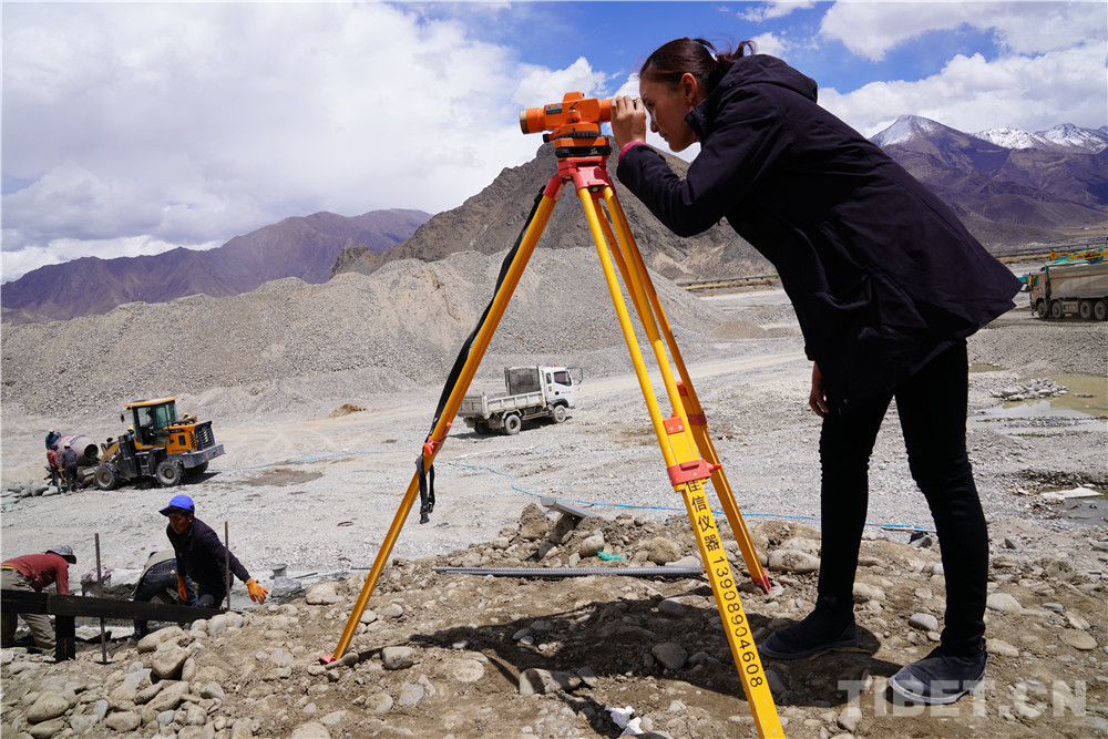 圖為洛桑白珍在工地上測量放線中
