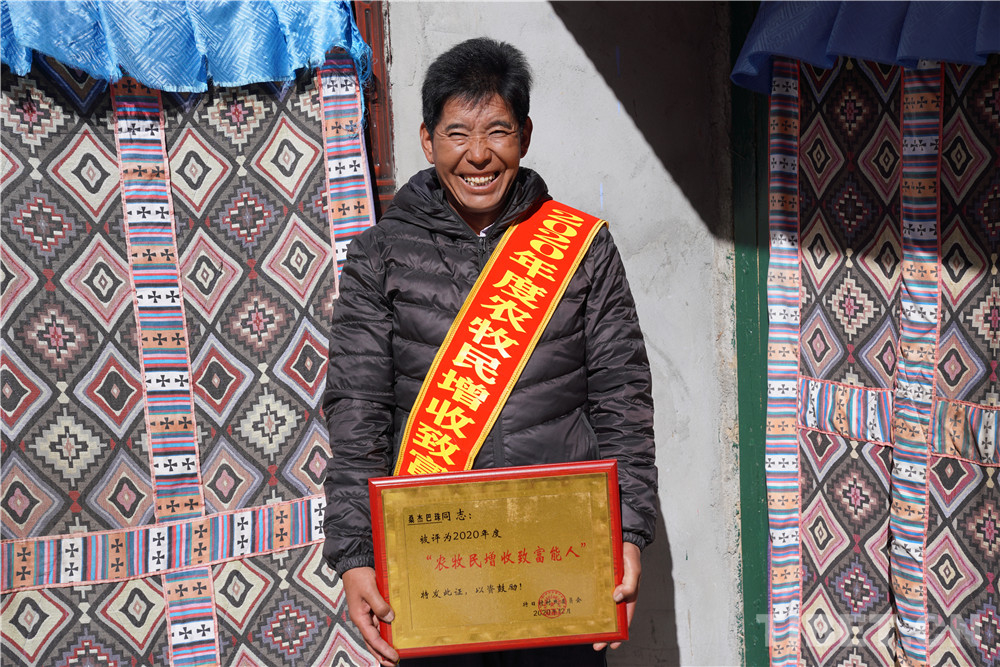 勞動致富的桑杰巴珠。他曾經(jīng)是享受國家補(bǔ)助的一般貧困戶。為了早日摘掉貧困帽子,自2019年開始,他先后貸款5萬元購買拖拉機(jī),在工地上搞運(yùn)輸;參加了涂裝工、抹灰工培訓(xùn)班,以技術(shù)求創(chuàng)收;在拉薩、澤當(dāng)承包工地人工。艱辛的努力收獲了香甜的碩果,如今的桑杰巴珠日工資最低300元;2020年帶動本村12人就業(yè),共創(chuàng)收達(dá)48萬多元。他的大女兒米瑪卓瑪于2018年考上了湖北理工學(xué)院漢語文專業(yè),小女兒拉巴曲珍考上了山南完中,曾經(jīng)的困難戶華麗轉(zhuǎn)身成為小康人家。
