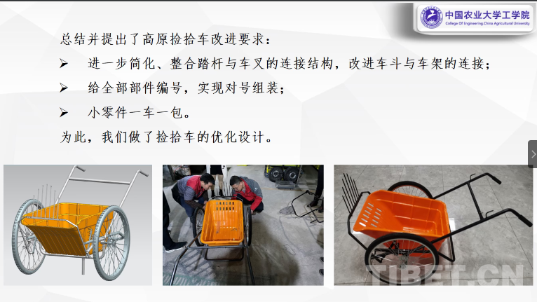 啟動會上,高原撿拾車研發(fā)首席專家中國農(nóng)業(yè)大學(xué)工學(xué)院教授王光輝介紹了高原撿拾車最新改版的情況。他表示,針對過去推廣中發(fā)現(xiàn)的個別問題,對車子進(jìn)行了優(yōu)化設(shè)計,去掉了易發(fā)生損壞的控叉線閘,調(diào)整了車身的踏桿與車叉的連接結(jié)構(gòu),改進(jìn)車斗與車架的連接,做到了對號組裝和小零件一車一包等,使安裝更加便捷、使用更加方便、車子更加堅(jiān)固。