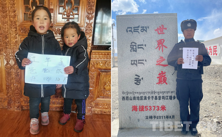 這是一張拼版照片,姐姐洛桑卓瑪,今年5歲,妹妹益西卓嘎,今年3歲。她們的父母——洛桑曲扎和索郎卓瑪,一個是浪卡子縣普瑪江塘鄉(xiāng)的移民管理警察,一個是山南市的特警,夫妻倆已經(jīng)三年沒有在家陪兩個女兒過年了。春節(jié)將至,洛桑曲扎堅守在全國海拔最高的普瑪江塘邊境派出所,守護邊境,保衛(wèi)祖國。