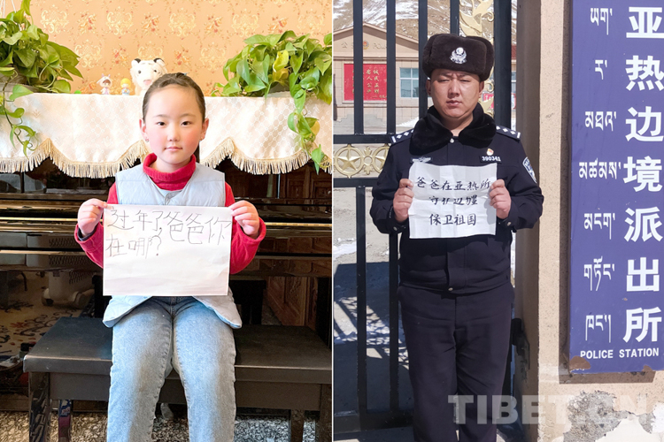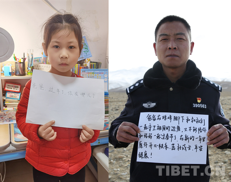 這是一張拼版照片,小女孩名叫旦增諾央,今年8歲,到現(xiàn)在還沒有和爸爸一起過過年。爸爸旦增尼瑪是日喀則邊境管理支隊亞熱邊境派出所所長,春節(jié)將至,他和戰(zhàn)友們堅守在海拔5300多米的中尼邊境一線,他通過這種方式表達對孩子的思念,相信慢慢長大的孩子一定能夠理解自己。