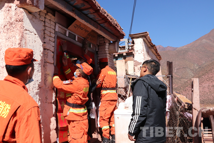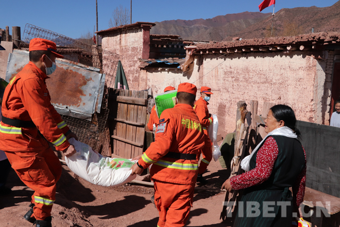 圖為卡若區(qū)森林消防中隊(duì)指戰(zhàn)員抬著慰問(wèn)品送到困難群眾家中