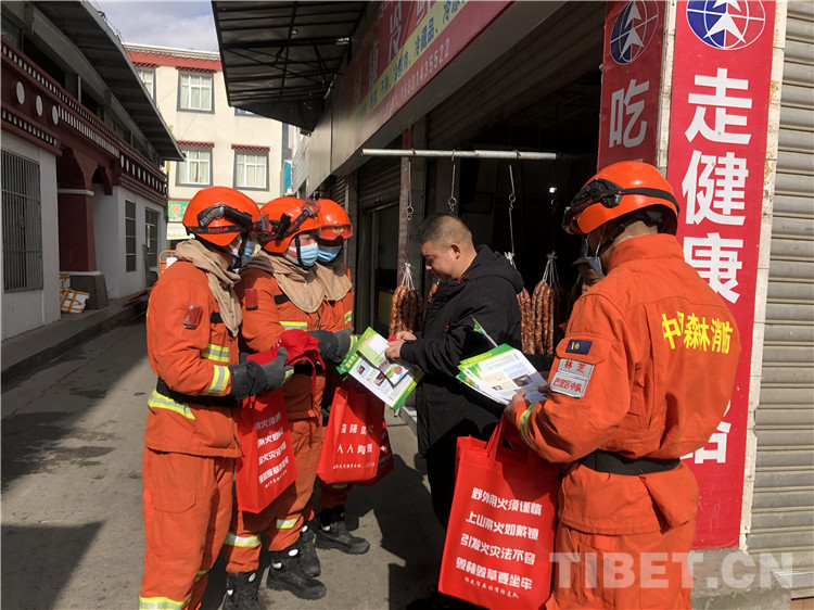 圖為米林縣森林消防中隊(duì)指戰(zhàn)員們走街串巷向居民們宣傳防火小常識(shí)并發(fā)放宣傳資料