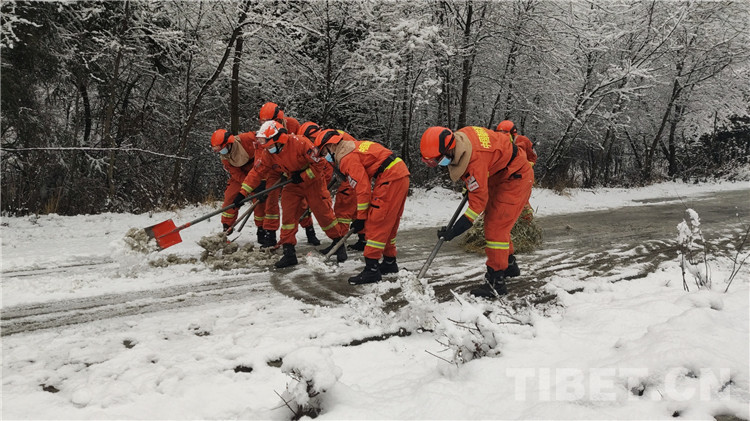 圖為消防員們正在清理道路積雪,為過往車輛保駕護(hù)航