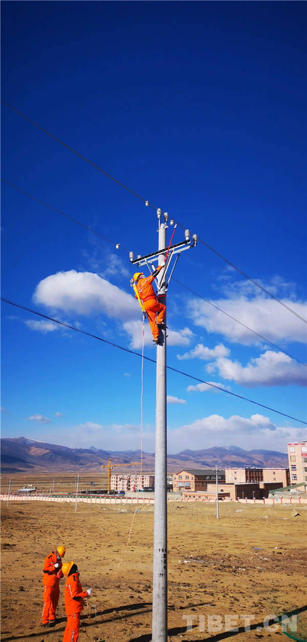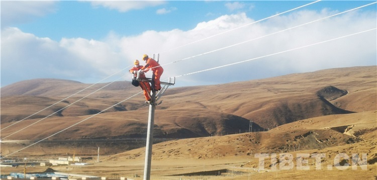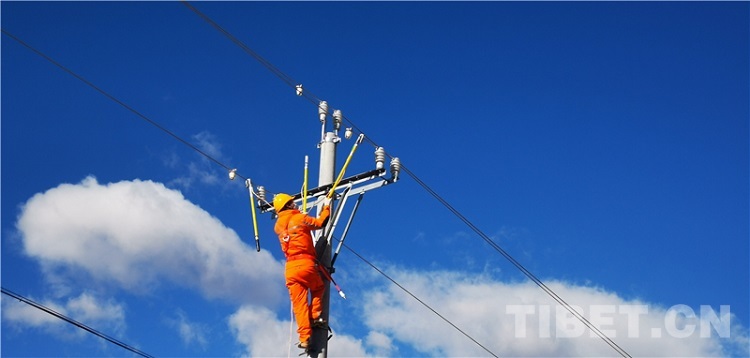 圖為國網(wǎng)理塘供電公司工作人員正在檢查電力線路 攝影:洛澤仁