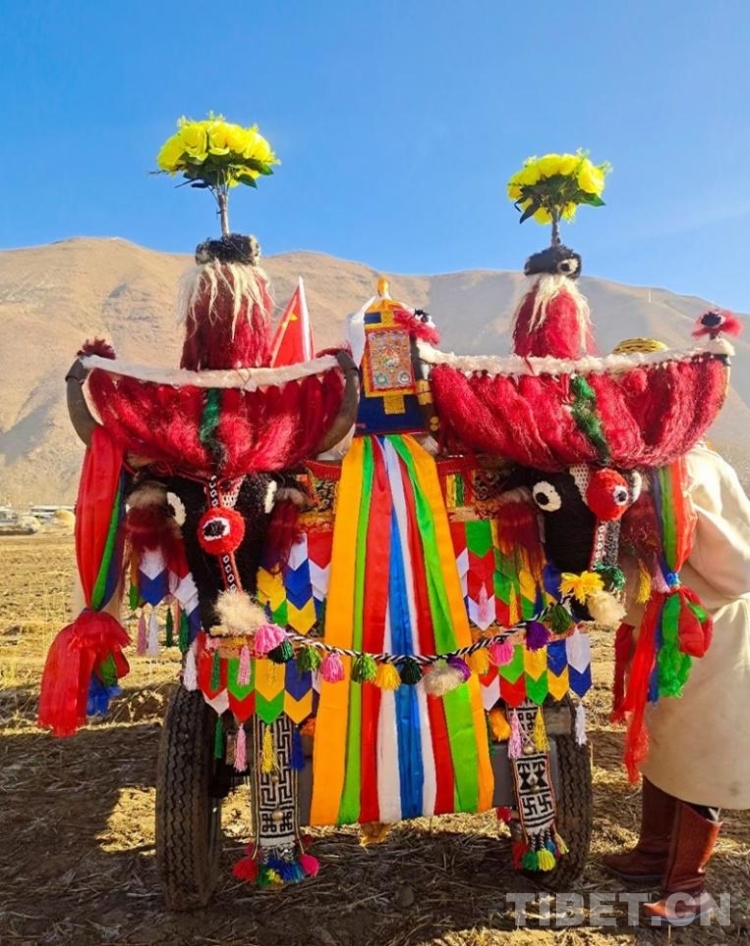 圖為拉薩市達(dá)孜區(qū)白納村春耕儀式上裝扮一新的“鐵牛” 攝影:卓嘎