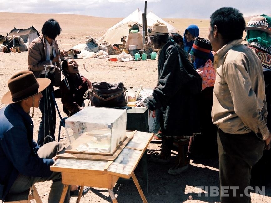 圖為在文部辦事處(現(xiàn)改為尼瑪縣)賽馬會(huì)上,“候鳥”型的漢族商販在擺攤鑲牙和修表(唐召明1987年攝)