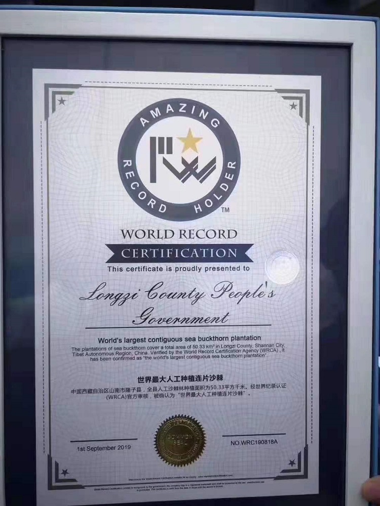 圖為2019年9月1日,山南市隆子縣的沙棘林被世界紀(jì)錄認(rèn)證機構(gòu)(WRCA)認(rèn)證為“世界最大人工種植連片沙棘”