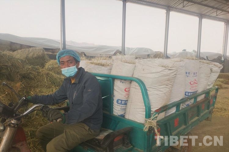 圖為崗尖村村民普布在養(yǎng)殖場運送草料