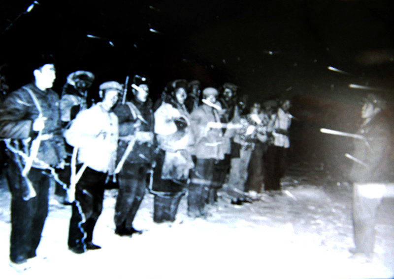1974年,公覺扎朗(左二)等18勇士既是干部,又是民兵。這是他們清晨在冒雪訓(xùn)練(唐召明翻拍資料圖片)