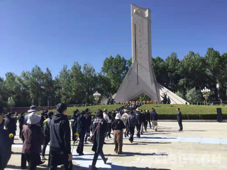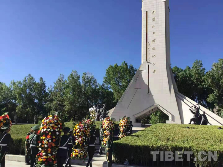 中共西藏自治區(qū)委員會、西藏自治區(qū)人大常委會、西藏自治區(qū)人民政府及各界群眾等分別敬獻(xiàn)的9個(gè)大型花籃一字排開,花籃紅色緞帶上書寫“革命先烈永垂不朽”8個(gè)金色大字。