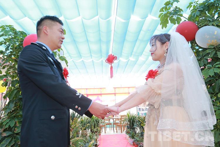 沒有鋪張豪華的迎親車隊,沒有山珍海味的結(jié)婚宴席,大家在陽關(guān)房里鋪上紅地毯、掛上彩色氣球,用鮮花和彩帶巧手裝點禮堂。繽紛的喜字掛在墻上,讓平日里莊嚴(yán)肅穆的營區(qū)變成了另一番景象,讓新娘感受到了只有警嫂才有的至高禮遇。藏青藍(lán)與婚紗白交融,浪漫與忠誠在海拔4300米演繹著動人的交響曲。