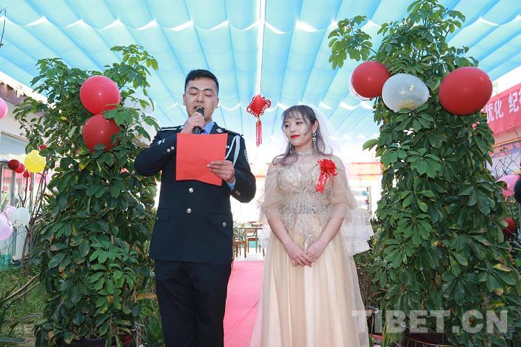 “今天能在警營里完成婚禮,非常的激動。結(jié)婚是女人一生中最幸福的時刻,非常感謝單位的領(lǐng)導(dǎo)能給我們這樣的機(jī)會,讓我倆一起度過人生中最幸福的時刻。這次的婚禮非常的有意義,將是我們一生中最寶貴的回憶,警營讓我成為最美麗的新娘?!毙履锿鯊溺鴾I激動地說。(中國西藏網(wǎng) 通訊員/張拴根 記者/王佳豪)