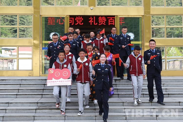 圖為西藏亞?wèn)|出入境邊防檢查站與駐地學(xué)生開(kāi)展“童心向黨 禮贊百年”系列活動(dòng)