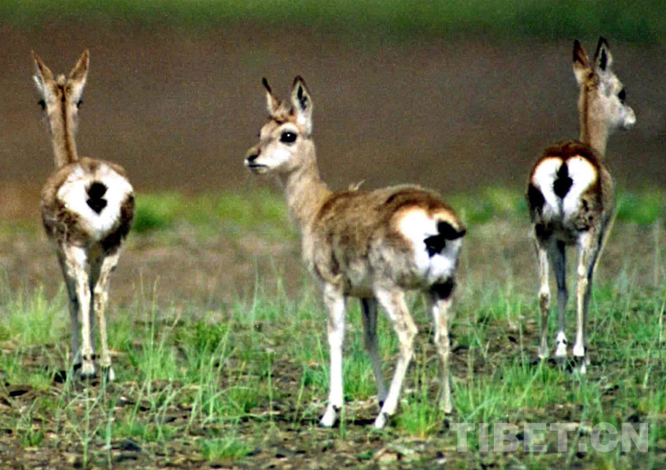 藏原羚(俗稱黃羊),元月份是交配期,當(dāng)年7月份是產(chǎn)羔期。它們個子不高,小巧而靈活,最明顯的標(biāo)志是屁股上有塊心形的白色印記,黑色的小尾巴搭在白屁股上,跑起來一甩一甩的,樣子十分可愛。它們少則三五只,多則幾十只甚至上百只一起活動。這種動物在藏北草原最為常見。