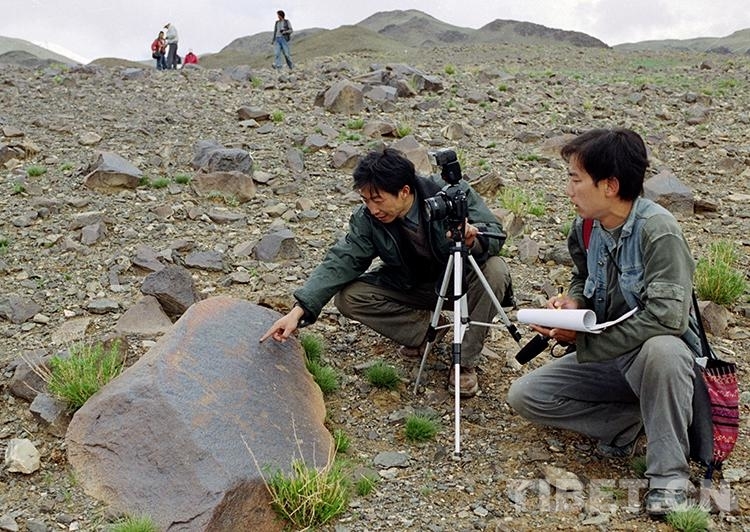 這是藏北無(wú)人區(qū)科考團(tuán)科考人員在對(duì)尼瑪縣榮瑪鄉(xiāng)加林山巖畫(huà)進(jìn)行科學(xué)考察(唐召明2001年攝)