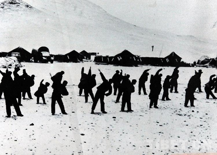 1976年,開(kāi)發(fā)藏北無(wú)人區(qū)的雙湖辦事處(現(xiàn)雙湖縣)拓荒者在駐地做廣播體操(唐召明翻拍照片)