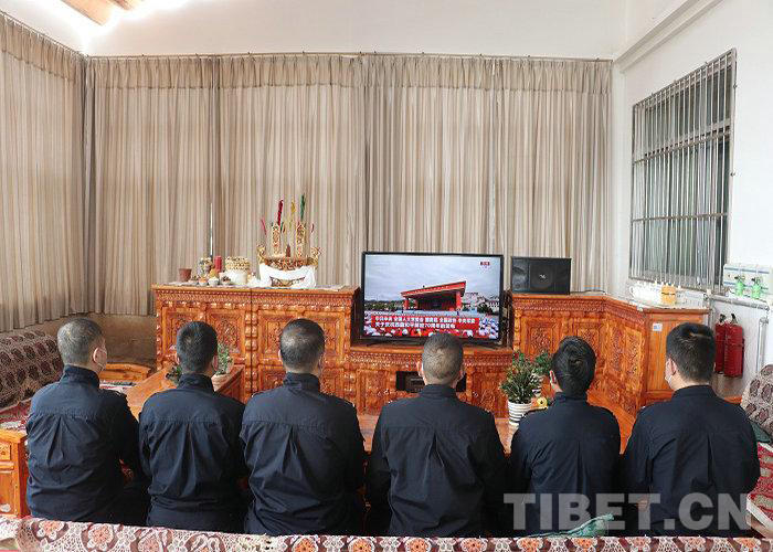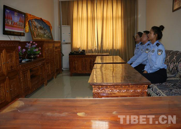 圖為西藏出入境邊防檢查總站執(zhí)法調(diào)查支隊廣大民警收聽收看慶祝西藏和平解放70周年大慶直播盛況