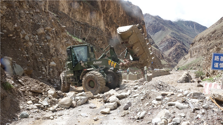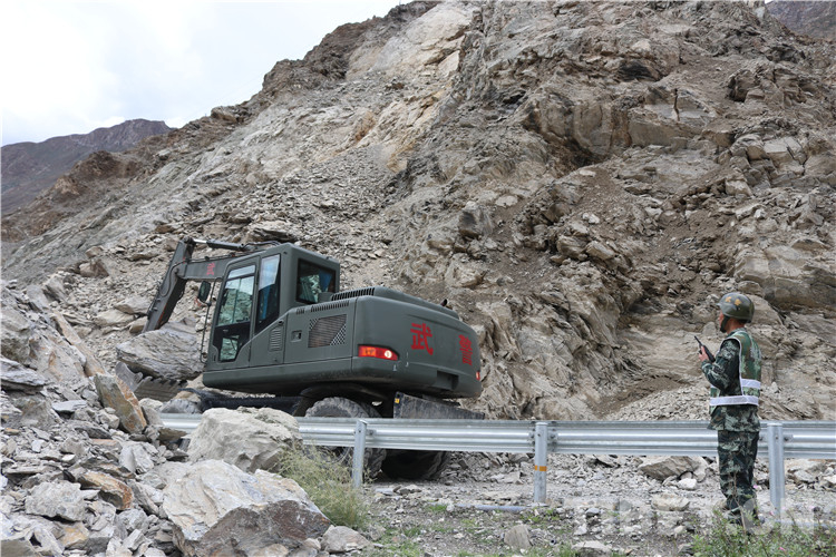 抵達(dá)現(xiàn)場后,武警官兵及時(shí)對(duì)災(zāi)害路段實(shí)施交通管制,并把滯留車輛疏導(dǎo)至安全區(qū)域,隨即對(duì)泥石流堆積物和塌方體進(jìn)行清理。因?yàn)?zāi)害點(diǎn)處于峽谷地帶,地勢(shì)十分險(xiǎn)要,作業(yè)面狹窄,且降雨及落石持續(xù)不斷,為確保搶通工作高效安全,指揮員科學(xué)指揮,安全員高度警惕,操作手快速搶通,各要素密切配合,給道路搶通工作爭取了寶貴時(shí)間。