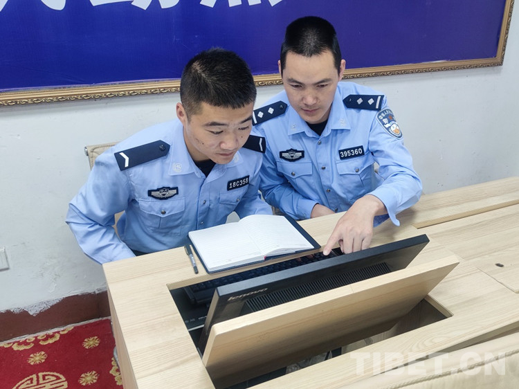 圖為劉華強(右)正在指導(dǎo)新警李東洪進行邊檢業(yè)務(wù)學(xué)習(xí) 攝影:尼瑪云丹